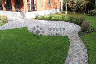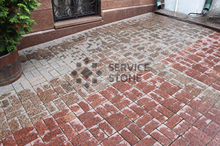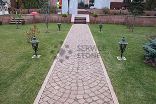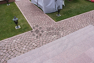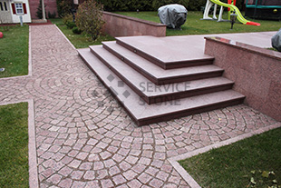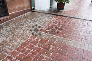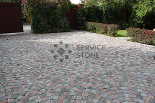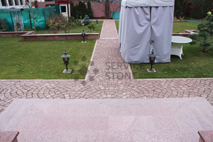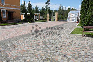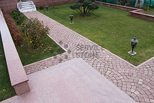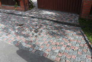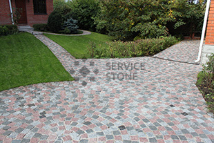 2016 год. Фото мощения колотой брусчаткой из Лезниковского гранита 100х100х50 на территории дома, д. Лапино, Одинцовский район.![]() |