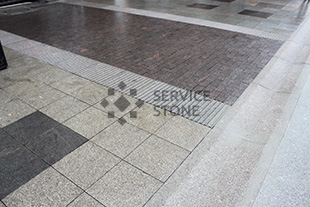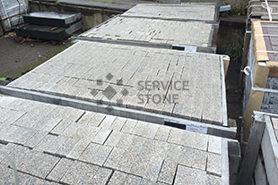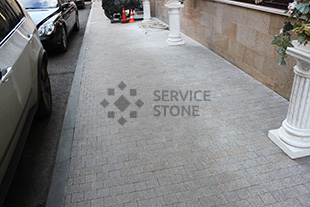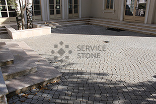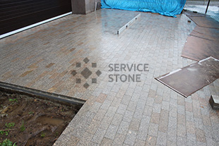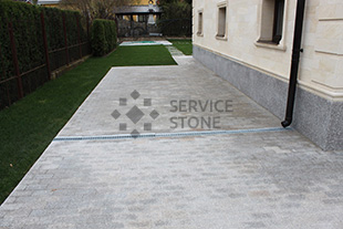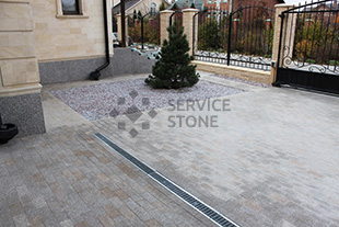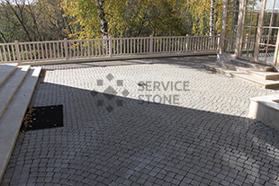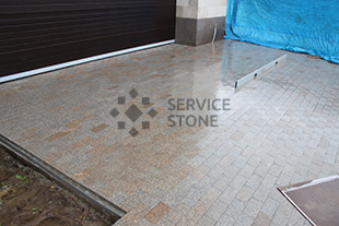 2016 год. Фото колото-пиленой гранитной брусчатки "Сосновый Бор" 100х100х50, мощение территории загородного дома, Московская область.![]() |