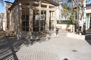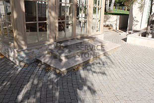 2015 год. Фото мощения пиленой гранитной брусчаткой "Сосновый Бор" 200х100х50 на территории частного дома, г. Москва.