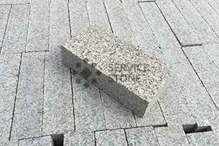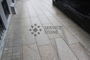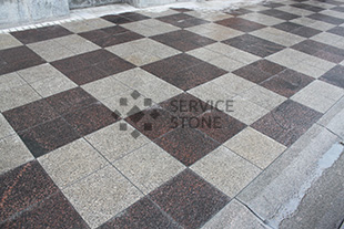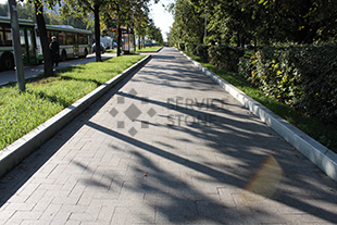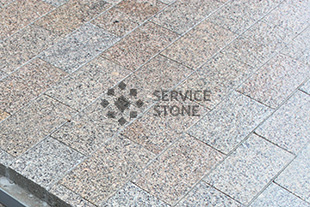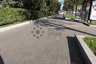 2014 год. Мощение брусчаткой из гранита Сосновый Бор, пешеходная зона на улице Сумской проезд, г. Москва.