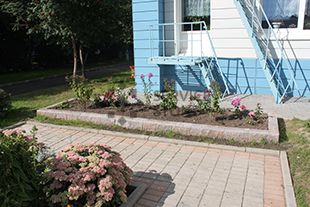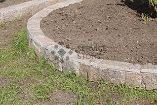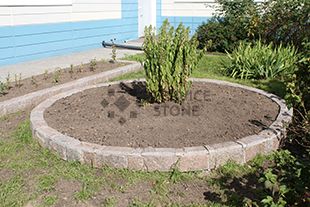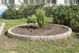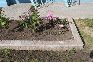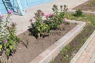 Отделка цокольным камнем из гранита ограждений клумб и цветников в Центре физической культуры и спорта ЮАО, город Москва.