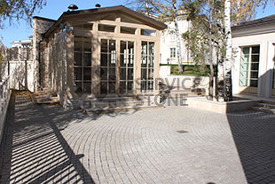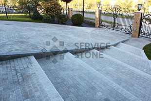 Сентябрь 2016. Фото мощения колото-пиленой брусчаткой "Сосновый Бор" и колотой брусчаткой "Габбро" на территории загородного дома, Одинцовский район, Московская область
