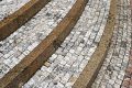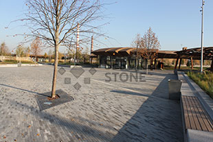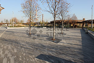 Сентябрь 2018 год. Фото мощения пиленой гранитной брусчаткой "Покостовский", "Габбро", "Гранатовый Амфиболит" и "Исетский" размер 200х50х50, Парк "Тюфелева роща", ЖК "Зиларт", г. Москва.